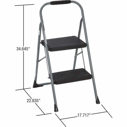 Cosco Two Step Big Step Folding Step Stool with Rubber Hand Grip. Make tasks less of a chore with these handy stools. Extra large steps provide stable footing and the lightweight design makes them easy to carry from room to room. Extra large slip resistant step. Type III, holds 200 lbs. Product dimensions open: 34.6″H x 17.7″W x 22.8″D. Product dimensions closed: 39″H x 17.7″W x 2.5″D.