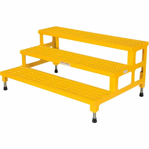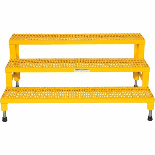 Adjustable height step stands provide convenient work platforms for hard-to-reach spaces. Step stands help bring the worker up to the optimum working height. Serrated surface provides maximum traction even in wet applications. Durable welded construction offers 500 lb. capacity. Legs are independently adjustable. Step rise is fixed at 7″H. Individual step depth is 12″. First step is height adjustable from 6 to 7-1/2″. Second step is adjustable from 13 to 14-1/2″H. 3 Step Models have a top step that is adjustable from 20″ to 22-1/4″H. Steel with safety yellow powder coat finish.