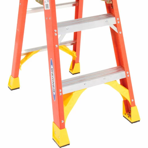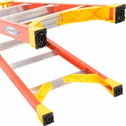 Lightweight and durable, these heavy-duty Werner® ladders are built for professional use. Plastic tool tray top for paint cans, brushes and tools. Four rivets attach top to each front rail. Back-up plates reinforce all top connectors. Full set of rear horizontals spaced one foot apart. Heavy duty internal spreaders connected with solid rivets. All steps and rear horizontals are knee-braced. Double riveted, slip-resistant Traction-Tred® steps. Wider stance for stability. Seven layer fiberglass construction.