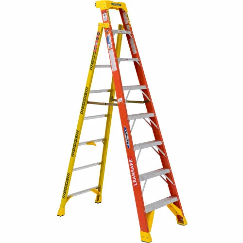 The L6208 Fiberglass 8 ft. Leaning Ladder is ideal for the professional. With a duty rating of 300 pounds, it features the LEANSAFEâ„¢ ladder top that secures tools and accessories, and is uniquely designed to securely lean against flat wall surfaces, wall corners, poles, and wall studs and perform as a standard stepladder.