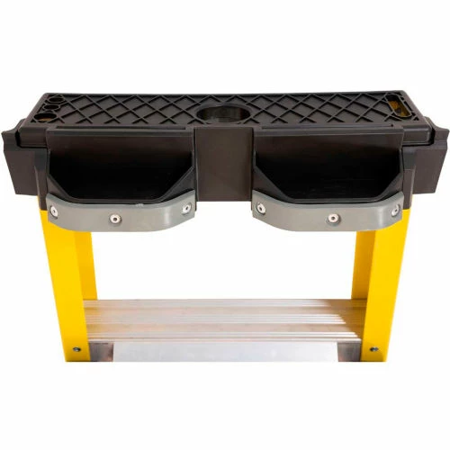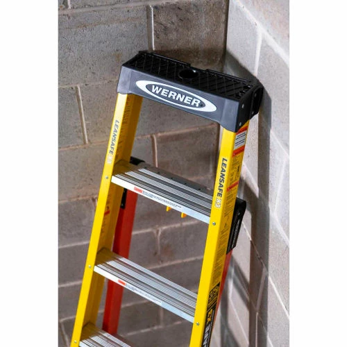 A two color design and highly visible LEANSAFE® logos to make this ladder easily distinguishable from a standard step ladder. The all in one top secures tools and accessories. The single latch design stays engaged when needed and is centrally located to easily open and close. LEANSAFE® ladder front feet have non-marring rubber foot pads that maximize the surface area in both the step ladder and leaning ladder modes.
